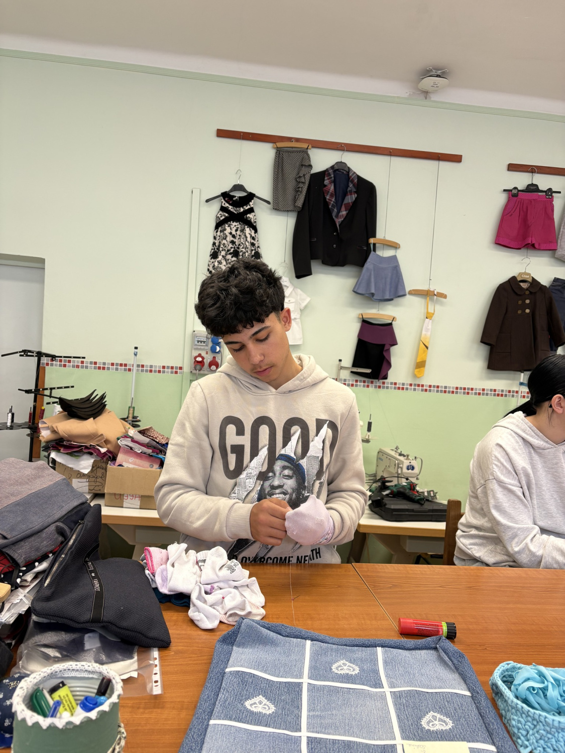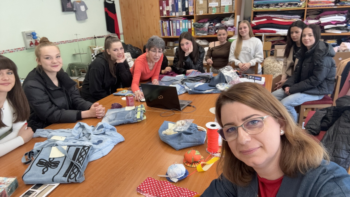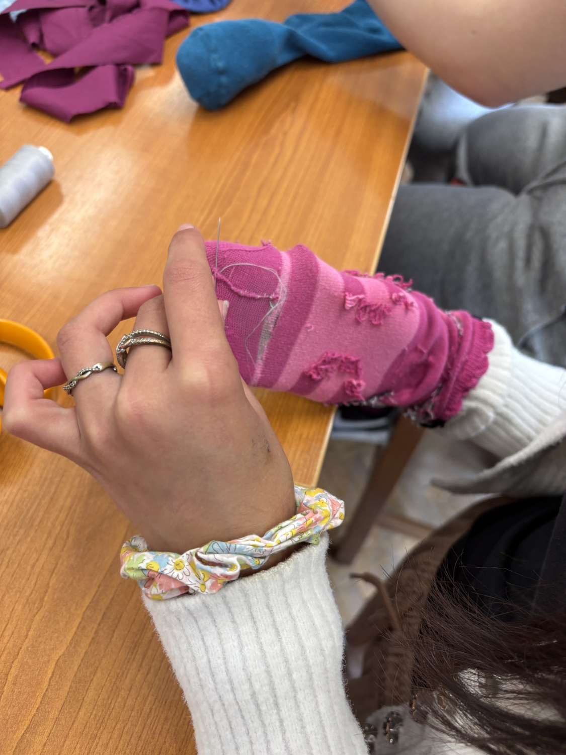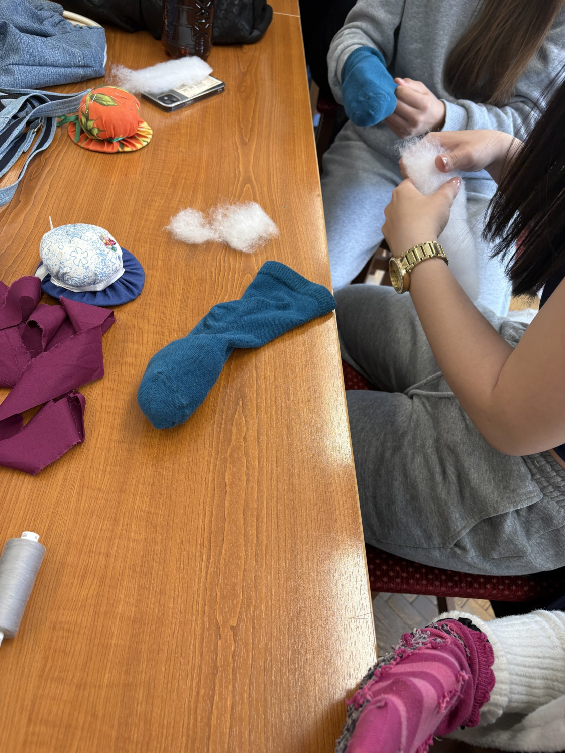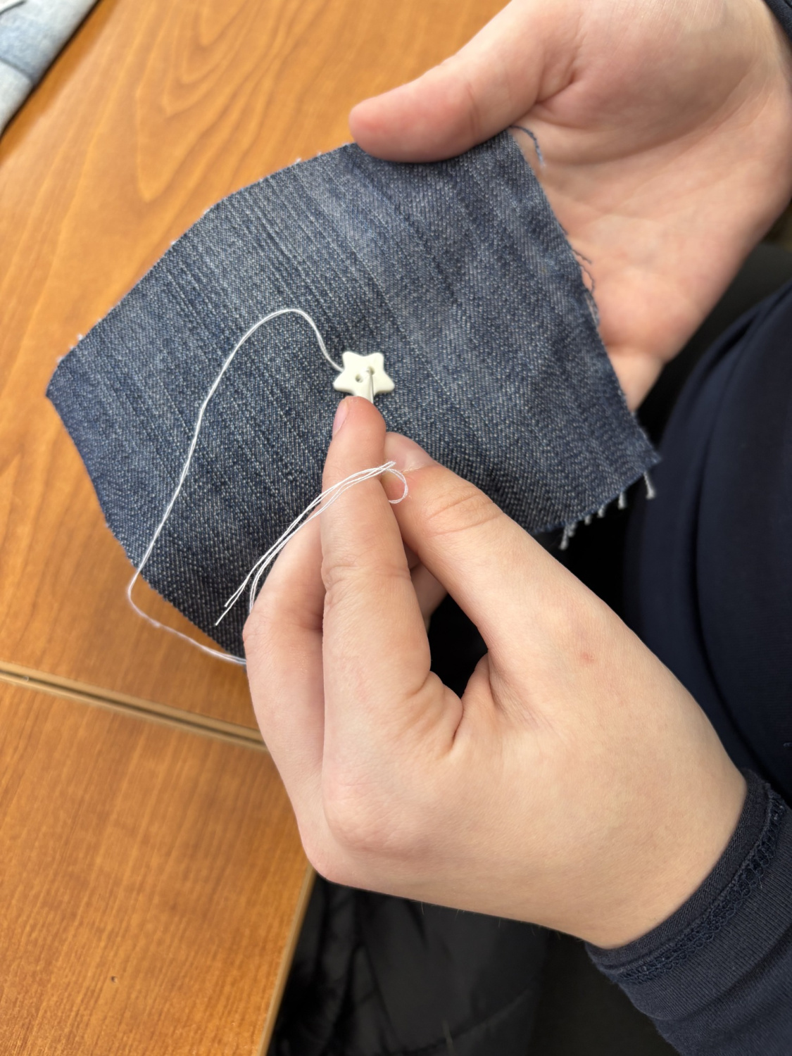 Az önként vállalkozó tanulók kipróbálhatták, hogyan lehet gombot felvarrni, zoknit stoppolni, zoknibábot készíteni, és megtekinthették a felnőttképzésben tanulók olyan alkotásait, amiket használt farmerekből készítettek.
