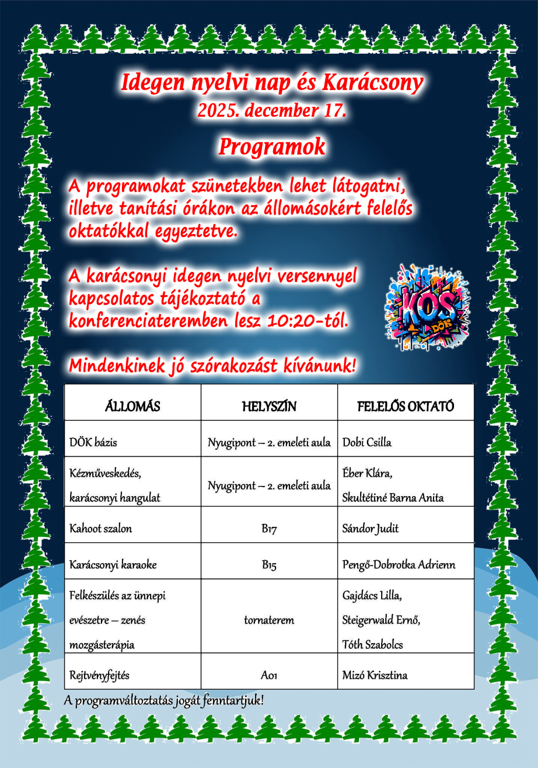 A karácsonyi idegen nyelvi versennyel kapcsolatos tájékoztató a konferenciateremben lesz 10:20-tól.