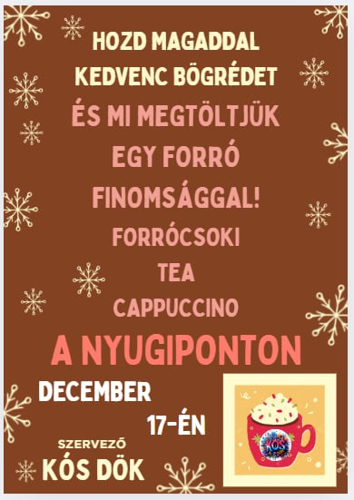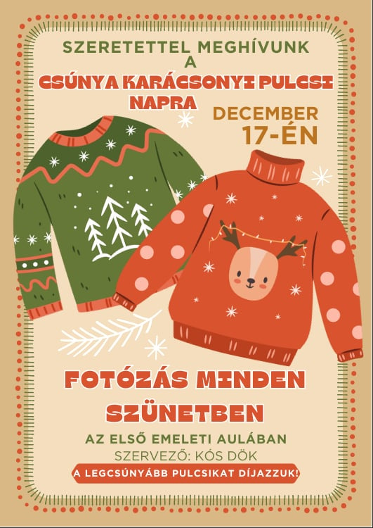 Változatos programokkal, karácsonyi hangulattal várjuk az érdeklődőket. Lesz zene, kézműveskedés, vetélkedők, karaoke, rejtvényfejtés, zenés mozgás, fotózás. Megmutathatod a legcsúnyább karácsonyi pulcsidat, és ha bögrét is hozol a DÖK megtölti neked egy forró finomsággal.