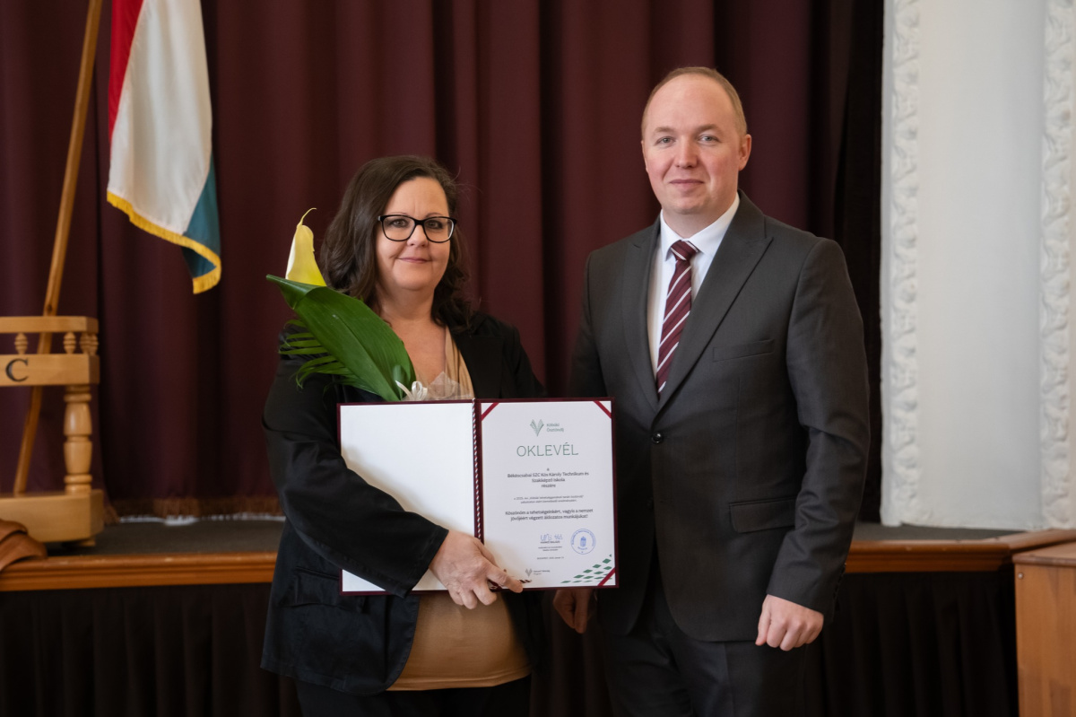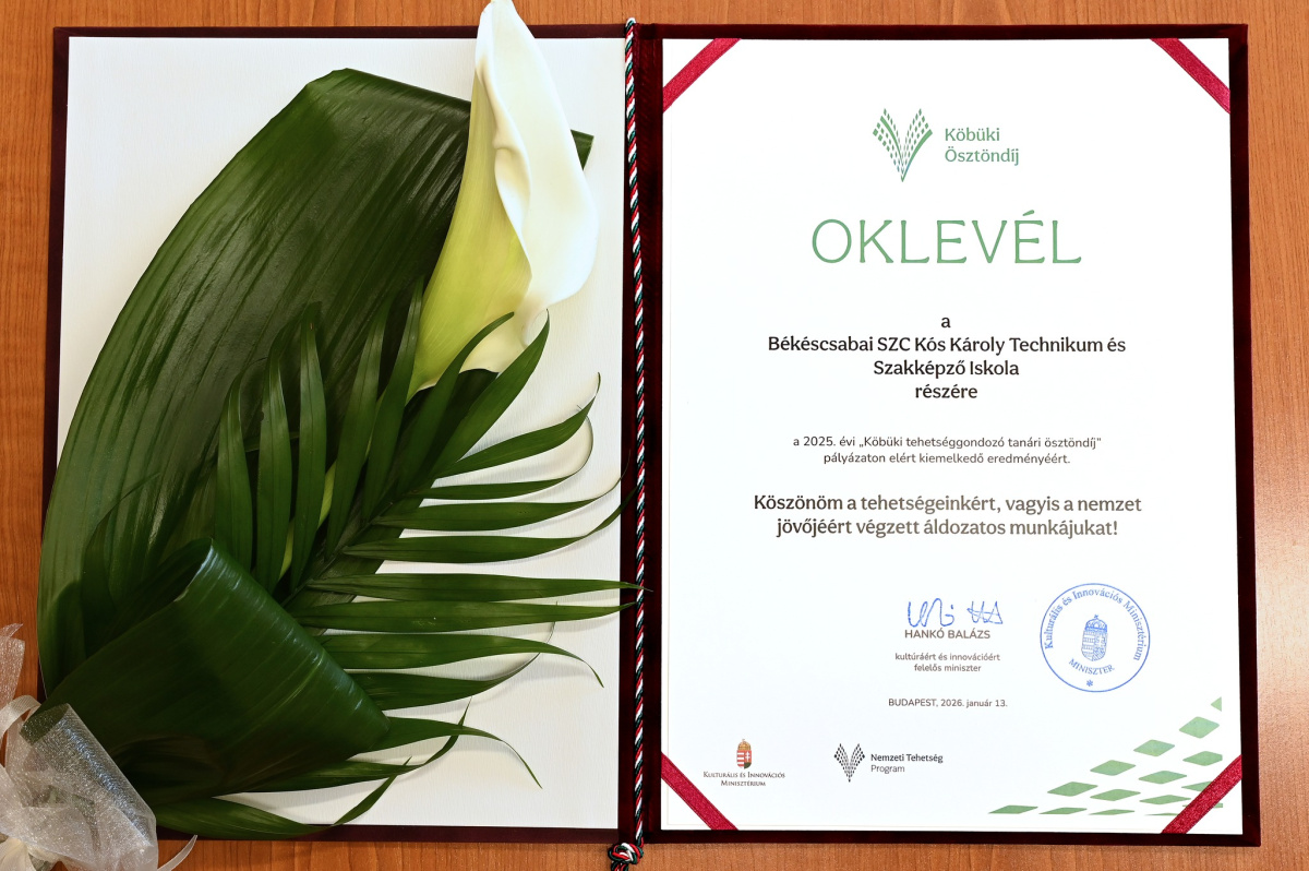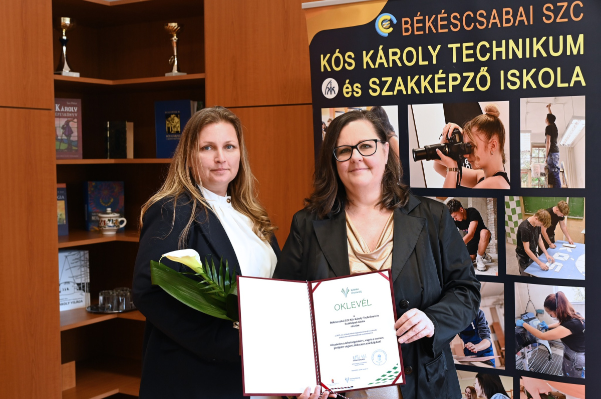 A Békéscsabai SZC Kós Károly Technikum és Szakképző Iskola elismerésben részesült a tehetséggondozásban nyújtott kiemelkedő eredményéért. A díjjal Dobi Csilla tanárnő szakmai munkáját ismerték el.
