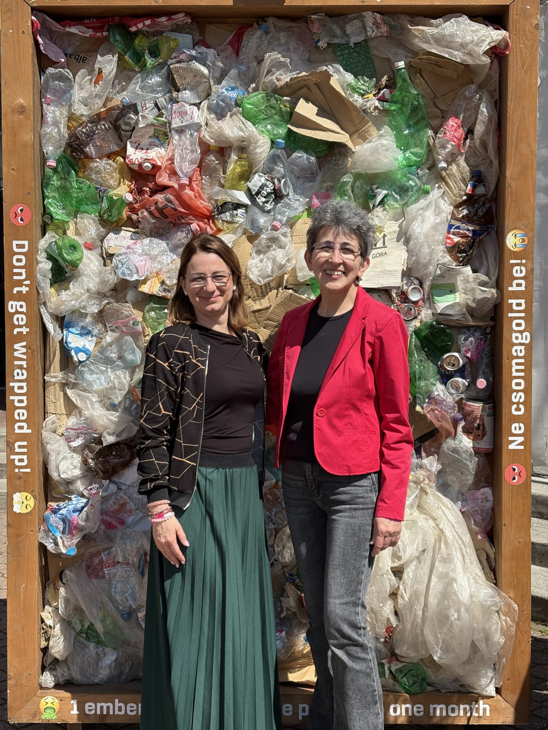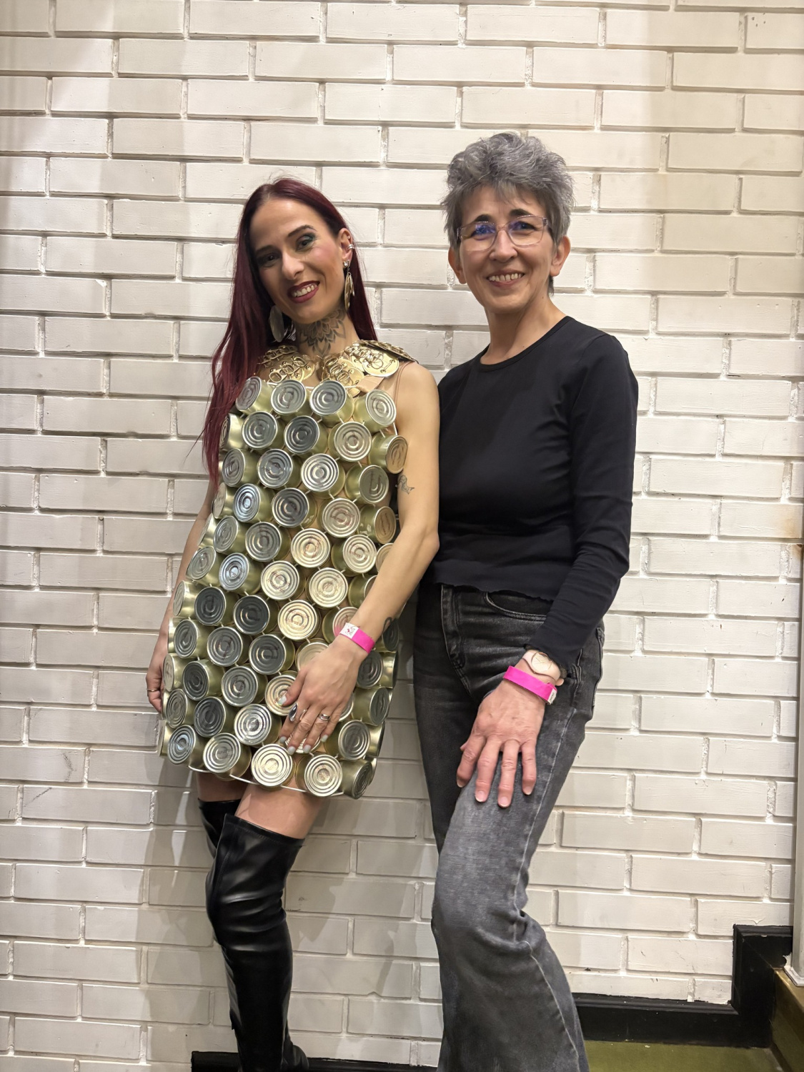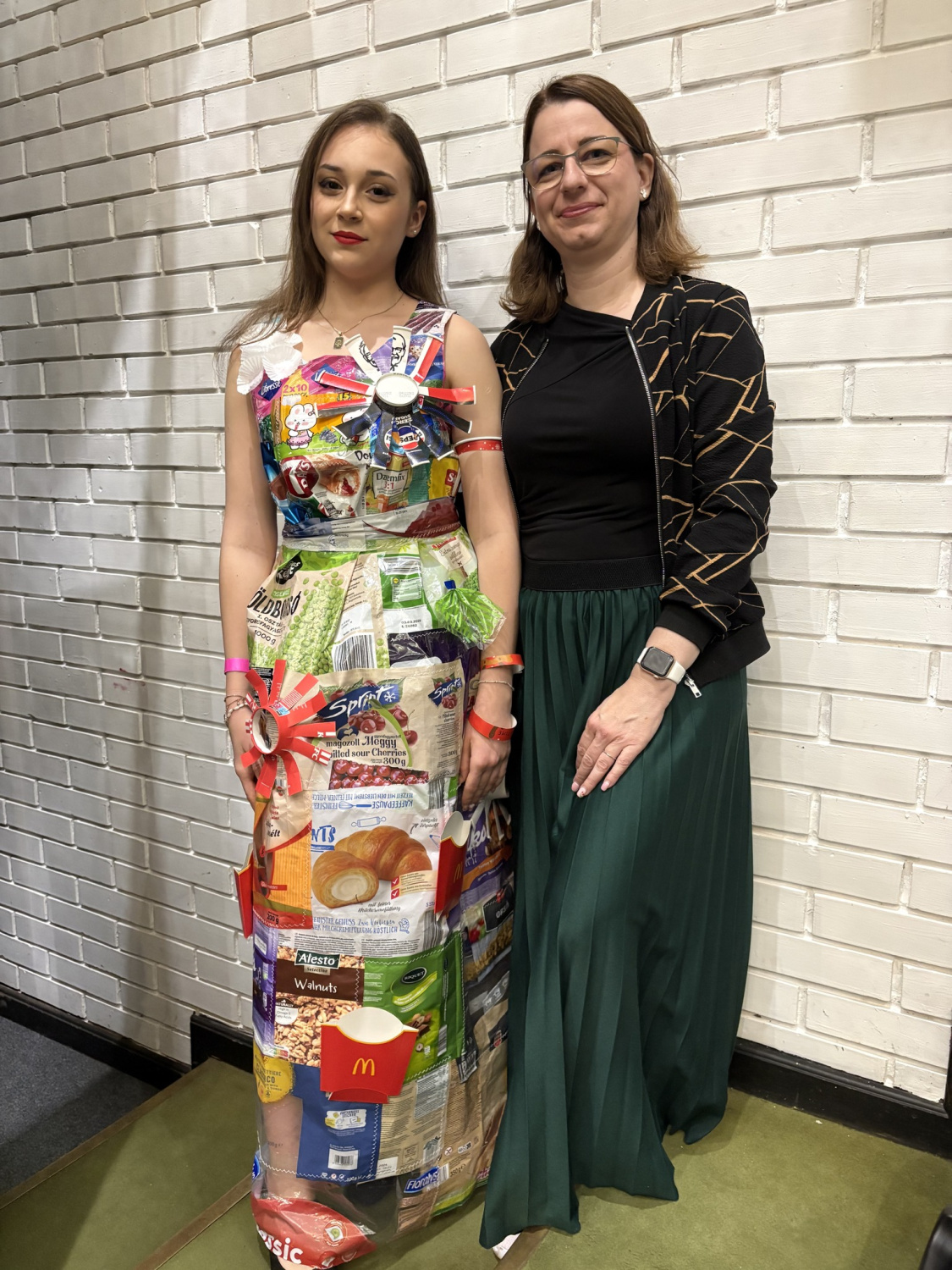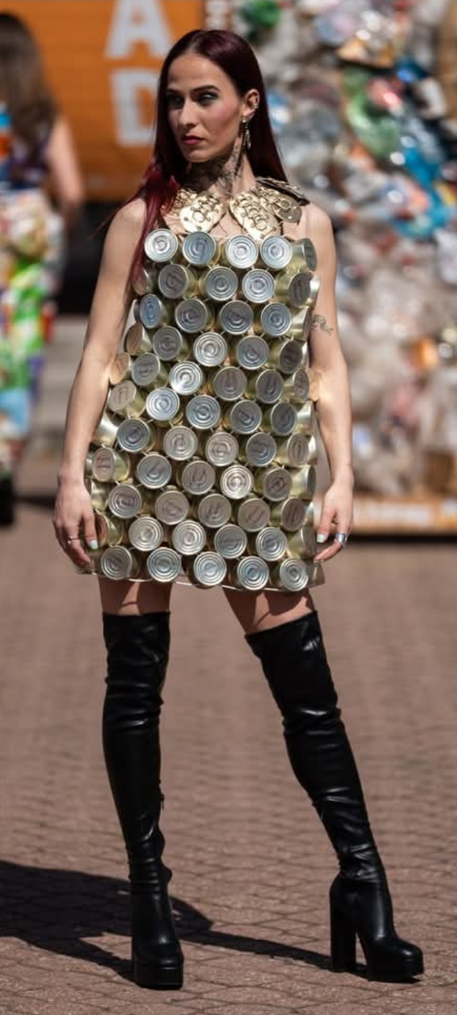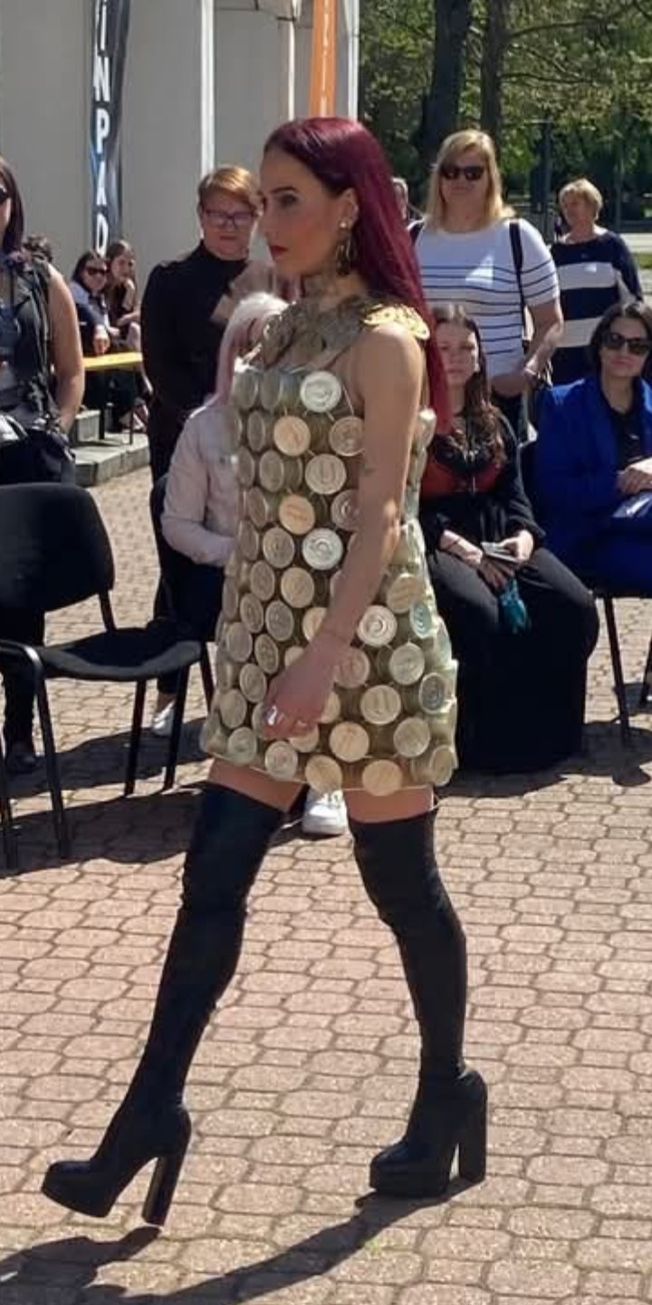Fehér Csilla divatszabó oktató a háztartásban használt zacskókból készítette el a verseny munkáját, Máténé Székely Erika pedig cica ételes konzerveket használt fel az öltözet készítéshez.