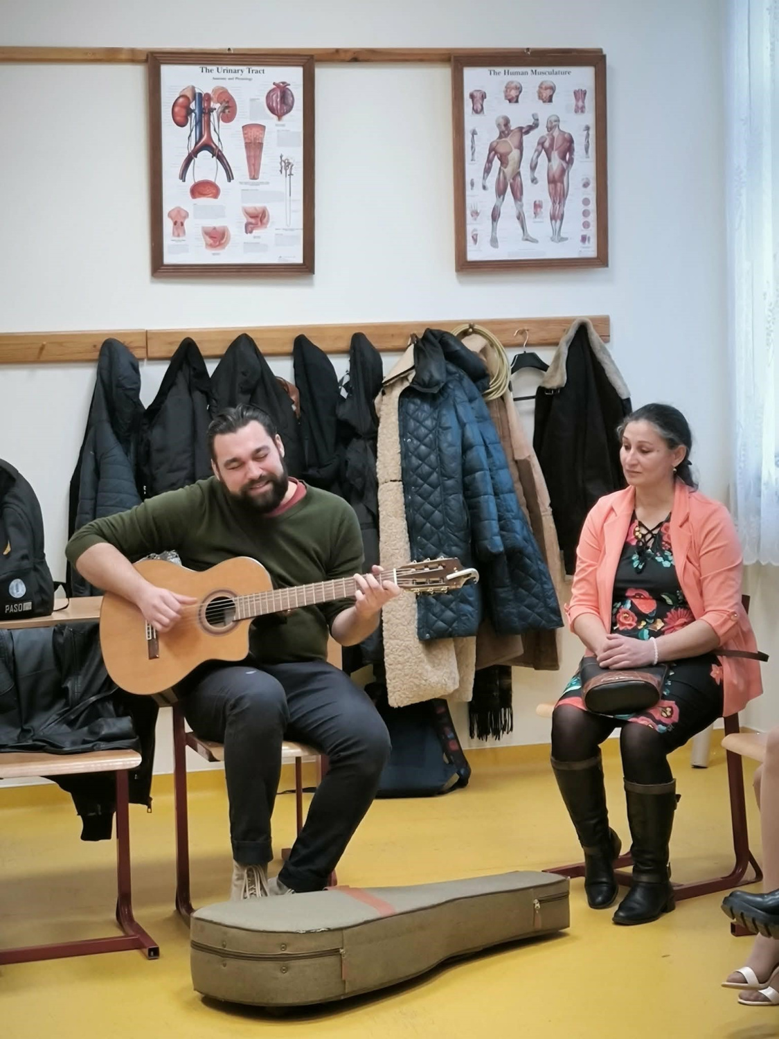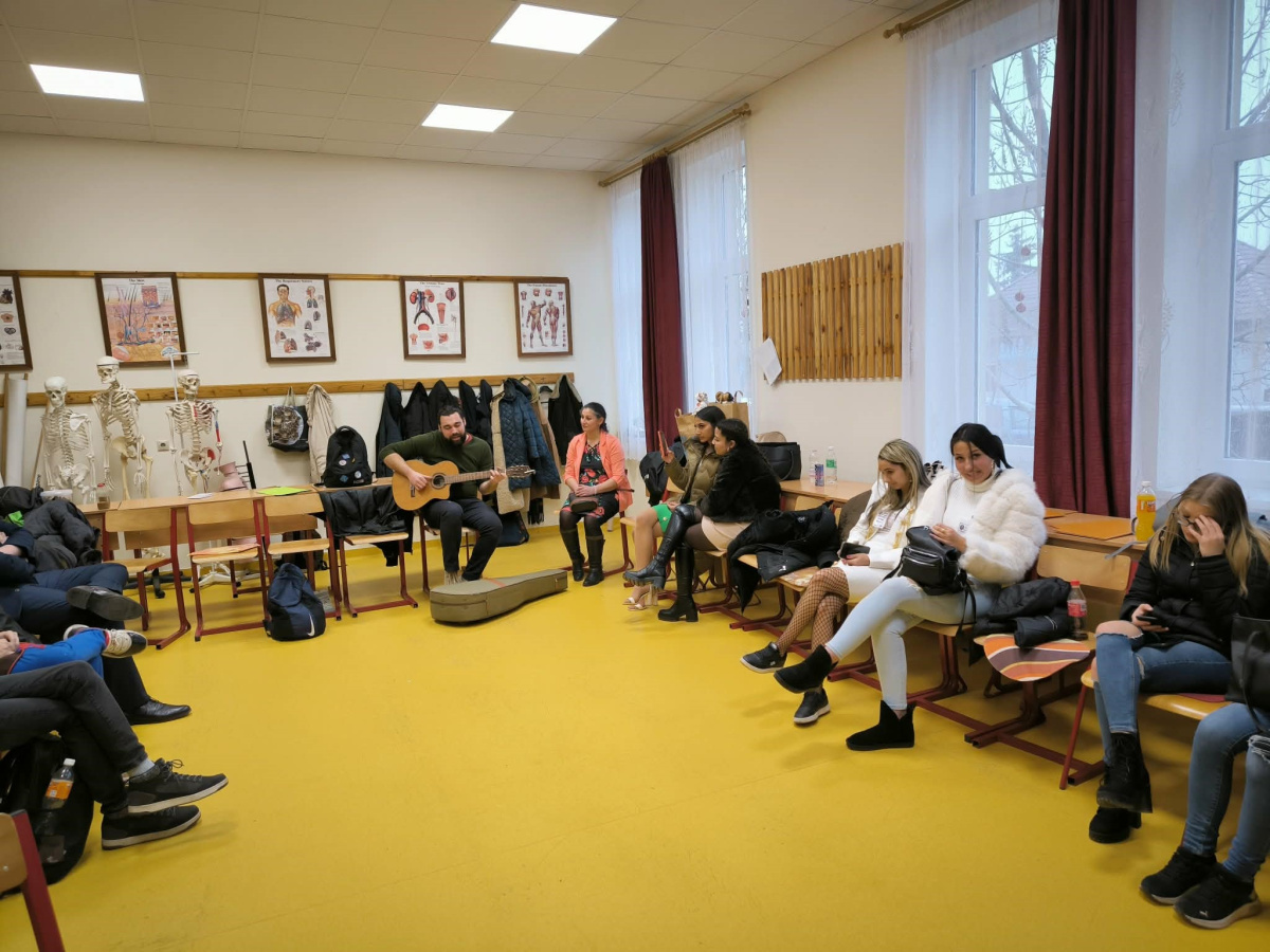 Pénteken egy roma származású zenekonzervatóriumot végzett zenész előadására mentünk, ahol az énekes a saját dalaiból adott elő egy rövid koncertet, melyet gitáron kísért. Közben és utána elmesélte a gyerekeknek, hogy ő is mélyszegénységből indult, de a tanulás és a zene szeretete segítségével mára egy sikeres ember lett, aki megbecsült tagja a társadalomnak.