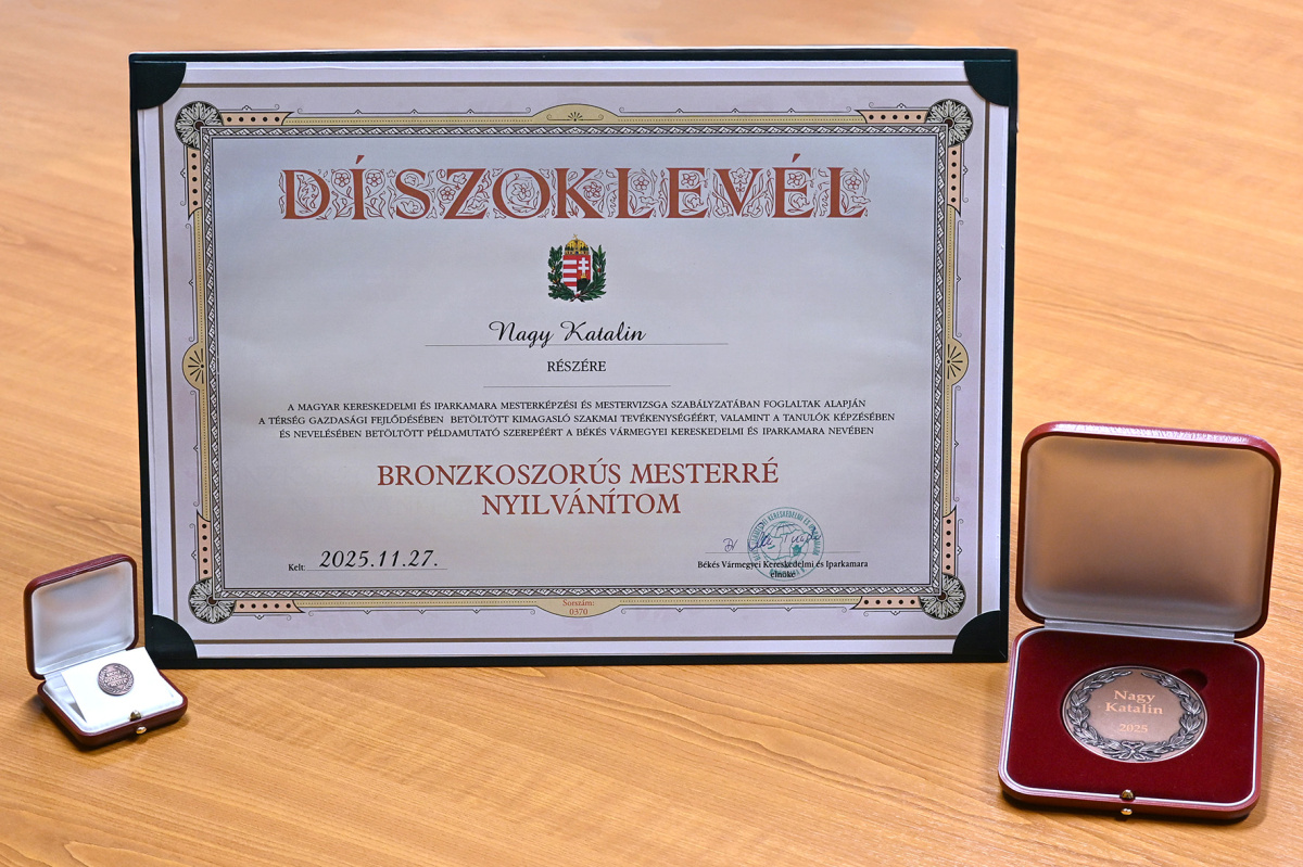 Nagy Katalint a Magyar Kereskedelmi és Iparkamara mesterképzési és mestervizsga szabályzatában foglaltak alapján a térség gazdasági fejlődésében betöltött kimagasló szakmai tevékenységéért, valamint a tanulók képzésében és nevelésében betöltött példamutató szerepéért a Békés Vármegyei Kereskedelmi és Iparkamara bronzkoszorús mesterré nyilvánította.